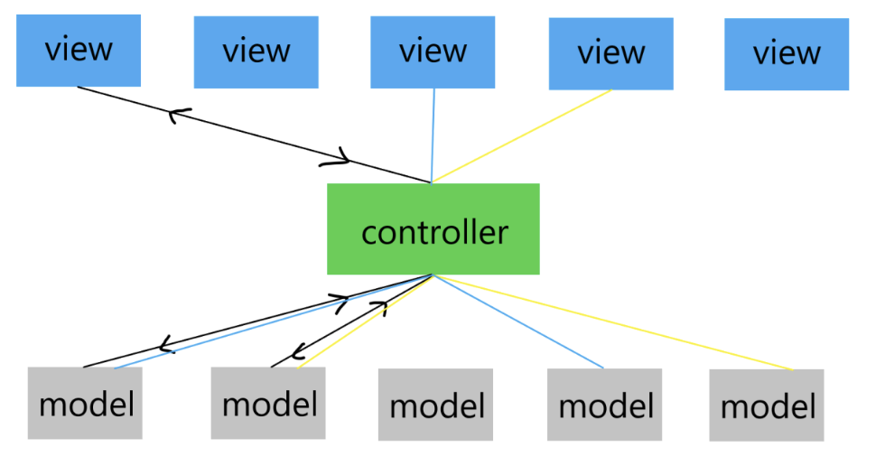 - 컨트롤러(Controller) : 모델과 뷰 사이의 상호작용을 관리, 어플리케이션의 흐름을 제어, 뷰에서 입력을 받아 모델에 전달하거나, 모델에서 변경된 데이터를 가져와 뷰에 반영