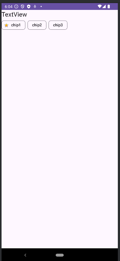 <?xml version="1.0" encoding="utf-8"?> <LinearLayout xmlns:android="http://schemas.android.com/apk/res/android" xmlns:app="http://schemas.android.com/apk/res-auto" xmlns:tools="http://schemas.android.com/tools" android:layout_width="match_parent" android:layout_height="match_parent" android:orientation="vertical" tools:context=".MainActivity" > <TextView android:id="@+id/textView" android:layout_width="match_parent" android:layout_height="wrap_content" android:text="TextView" android:textAppearance="@style/TextAppearance.AppCompat.Large" /> <com.google.android.material.chip.ChipGroup android:layout_width="match_parent" android:layout_height="match_parent"> <com.google.android.material.chip.Chip android:id="@+id/chip" style="@style/Widget.Material3.Chip.Assist" android:layout_width="wrap_content" android:layout_height="wrap_content" android:text="chip1" app:checkedIconVisible="false" app:chipIcon="@android:drawable/btn_star_big_on" /> <com.google.android.material.chip.Chip android:id="@+id/chip2" android:layout_width="wrap_content" android:layout_height="wrap_content" android:text="chip2" /> <com.google.android.material.chip.Chip android:id="@+id/chip3" android:layout_width="wrap_content" android:layout_height="wrap_content" android:text="chip3" /> </com.google.android.material.chip.ChipGroup> </LinearLayout>